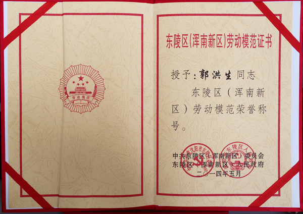 2014年4月26日,渾南新區表彰了2014年先進集體和勞動模范。藍英集團董事長郭洪生榮獲東陵區(渾南新區)勞動模范稱號。