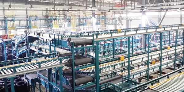 成品輪胎物流工序如下:硫化后的輪胎→硫化地溝線→ 冷卻緩存線→剪毛前緩存線→剪毛機(手動、自動)→外觀檢測前緩存線→外觀檢測設備→X光檢測緩存線→ X光檢測→ 均動檢測前緩存線→均動檢測設備→均動檢測合格品線→全息檢測環線→全息檢測設備→外觀復檢線。
